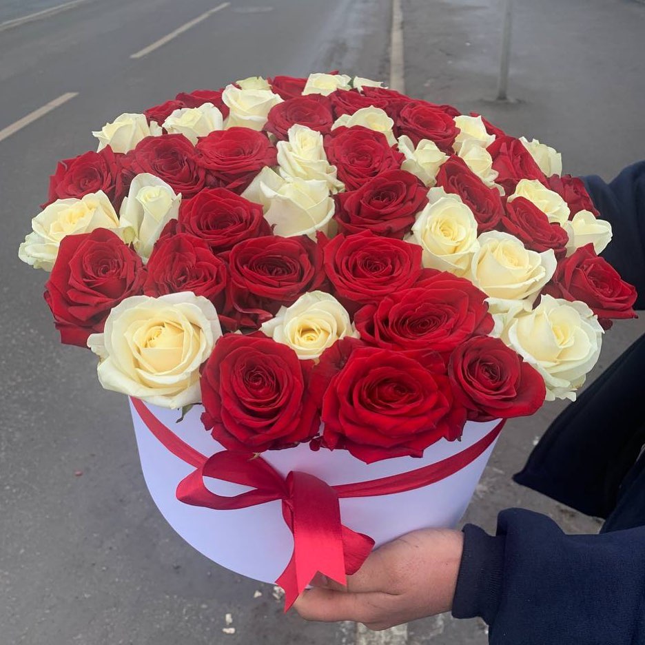 A charming blend of 48 fresh local roses in radiant red and creamy white, arranged beautifully in a white hat box. Ideal for heartfelt occasions, celebrations, or simply spreading joy.