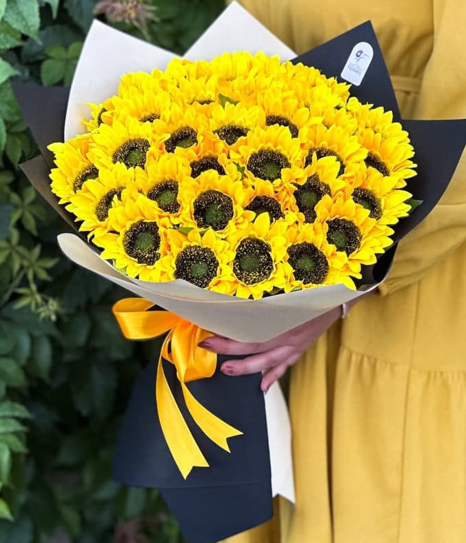 A grand and vibrant bouquet featuring 50 radiant sunflowers, symbolizing happiness, warmth, and positive energy. Arranged in a striking black and cream wrapper with a golden yellow ribbon, this bouquet makes a bold and joyful statement—perfect for celebrations, milestones, or to simply brighten someone’s day with sunshine.