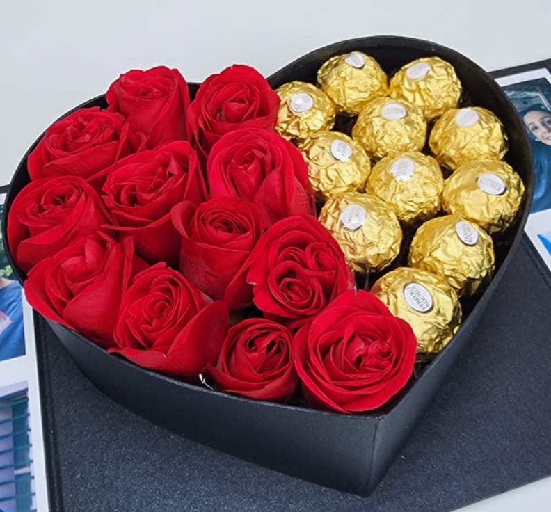 A stunning heart-shaped box filled with a romantic mix of 12 fresh red roses and 12 pieces of Ferrero Rocher chocolates. The perfect gift to express love, passion, and sweet affection – ideal for anniversaries, Valentine’s Day, or any heartfelt celebration. Elegantly arranged to leave a lasting impression.