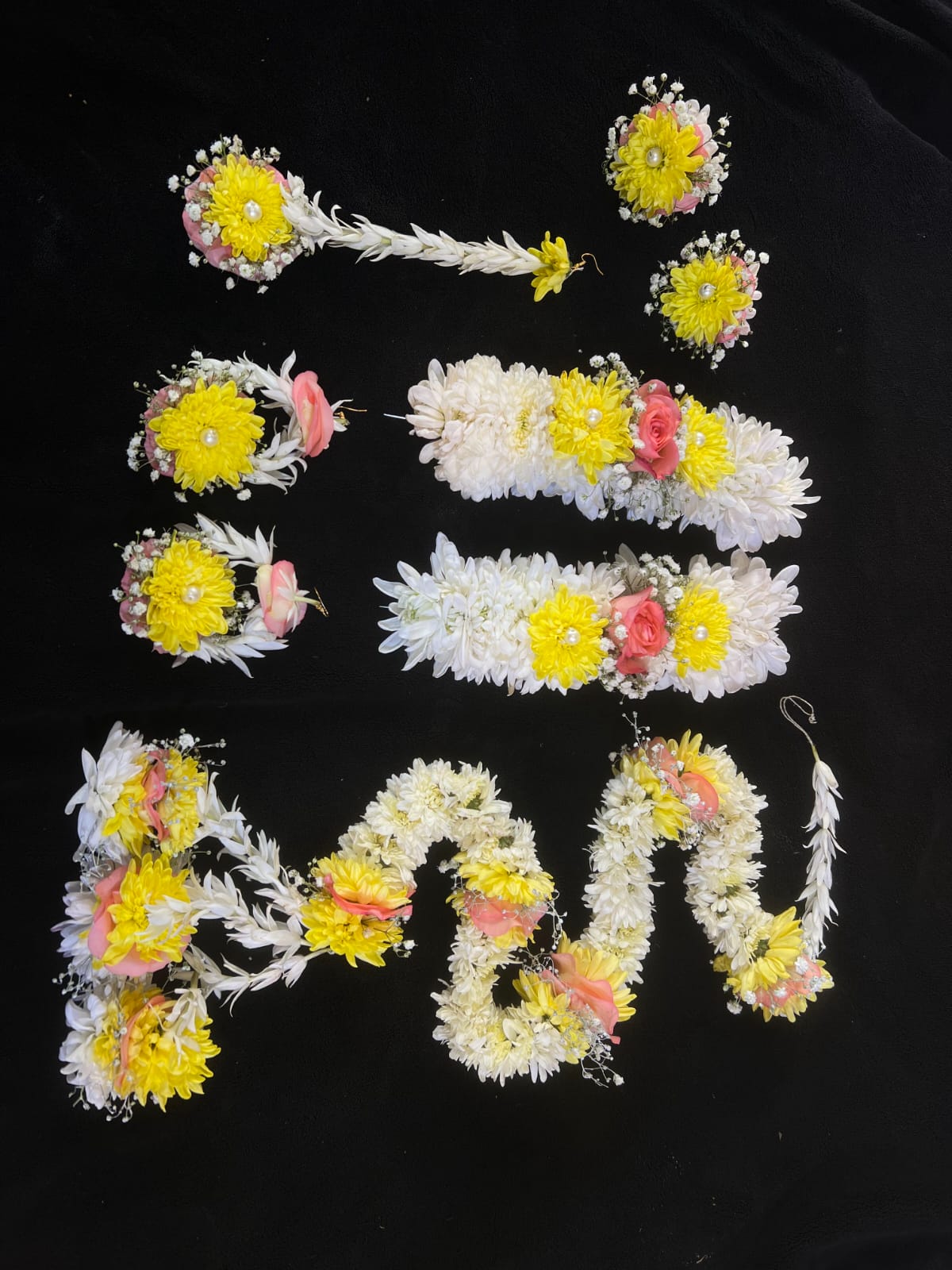 This Imported Dulhan Floral Jewelry Set is crafted with fresh yellow chrysanthemums, white blooms, soft pink roses, and accented with delicate gypsophila and pearls. The set includes a maang tikka, earrings, necklace, haathphool, bajubandh, garland, and waistband – perfect for mehndi, haldi, or bridal occasions.