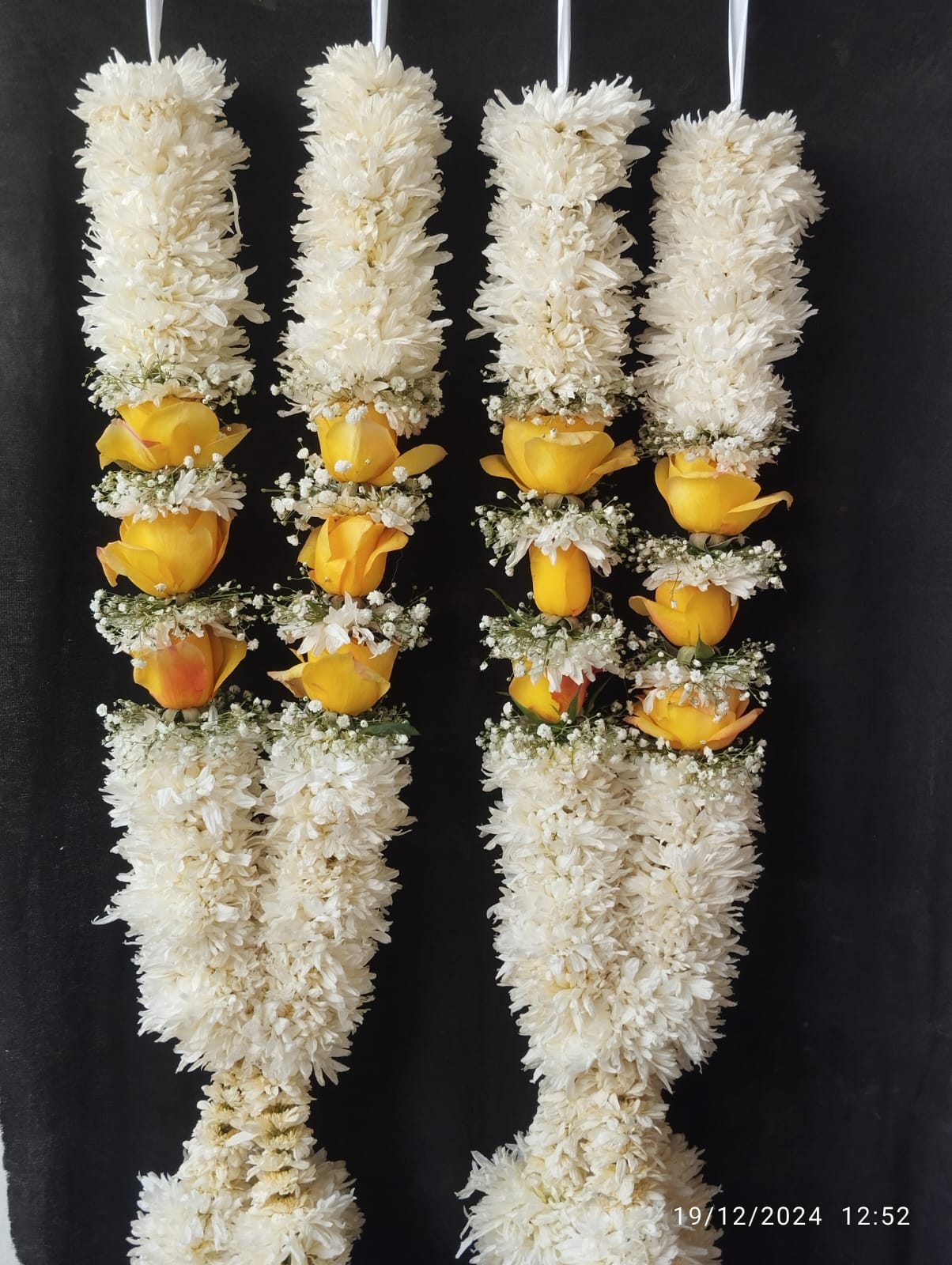 This Imported Har 1 Pair is crafted with bright yellow roses nestled in fluffy white chrysanthemums and baby’s breath. It offers a vibrant yet elegant touch for special traditional occasions.